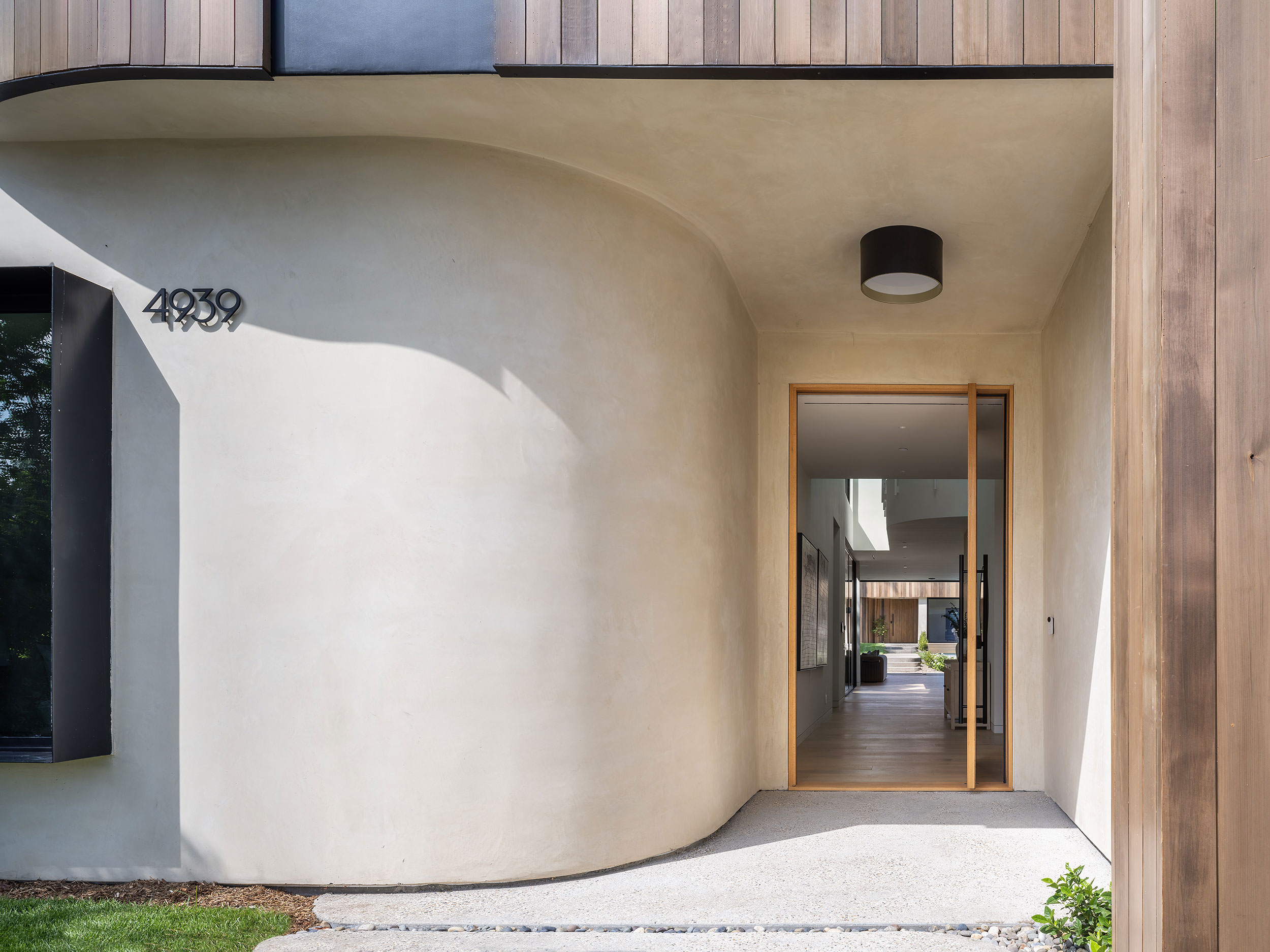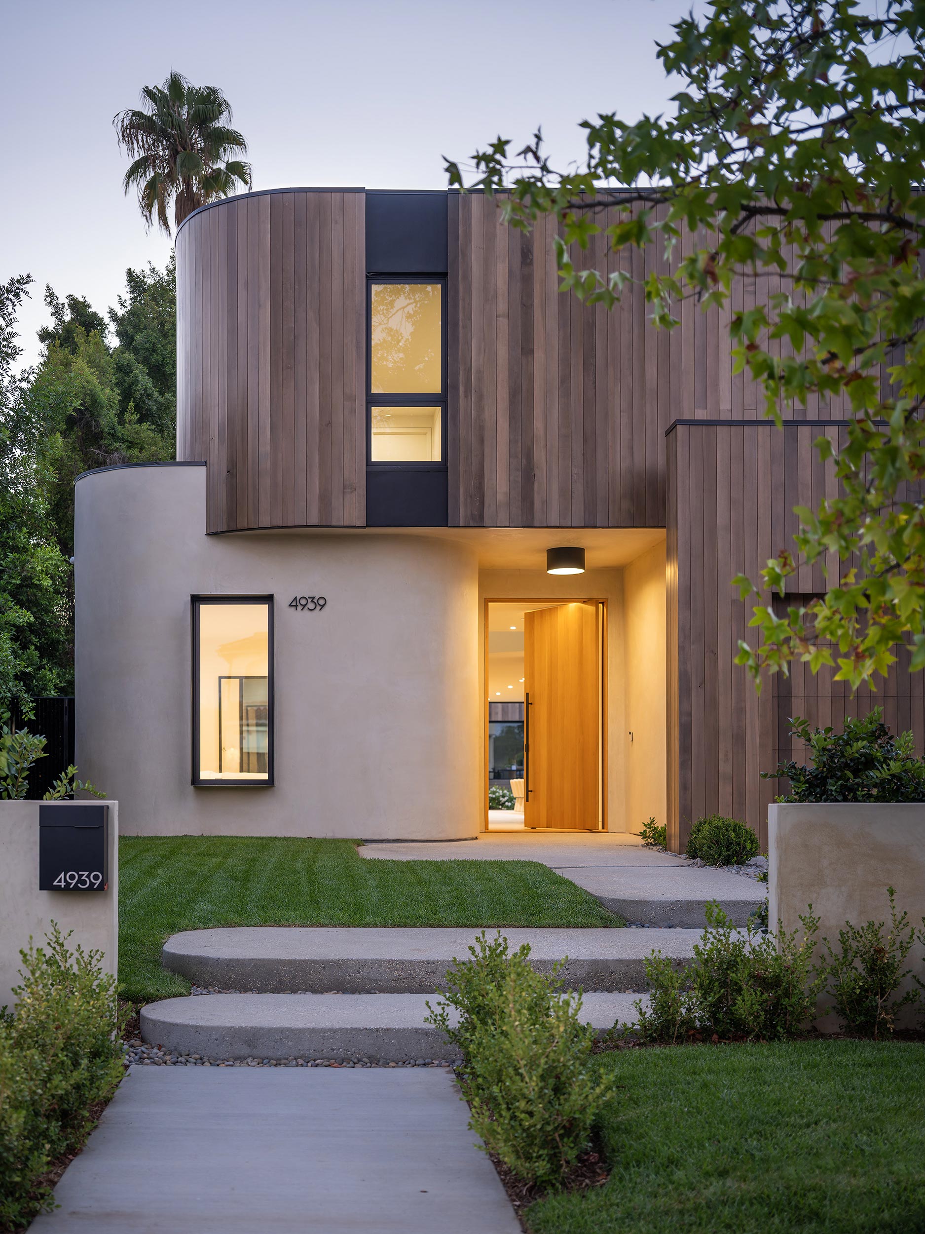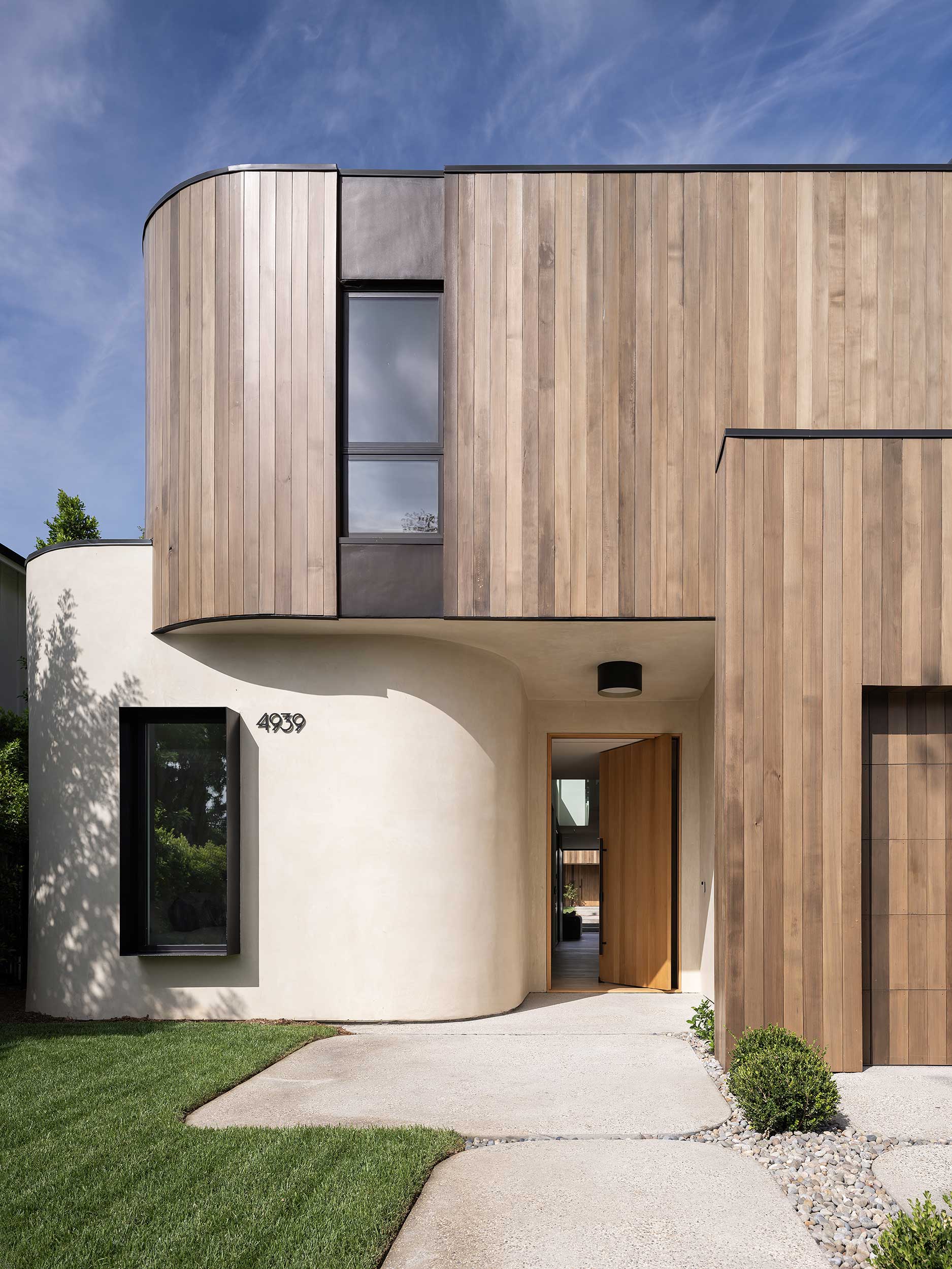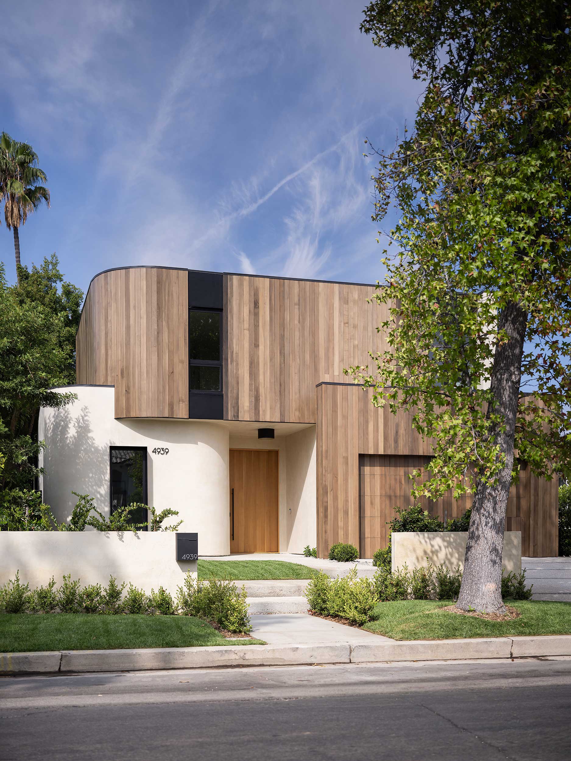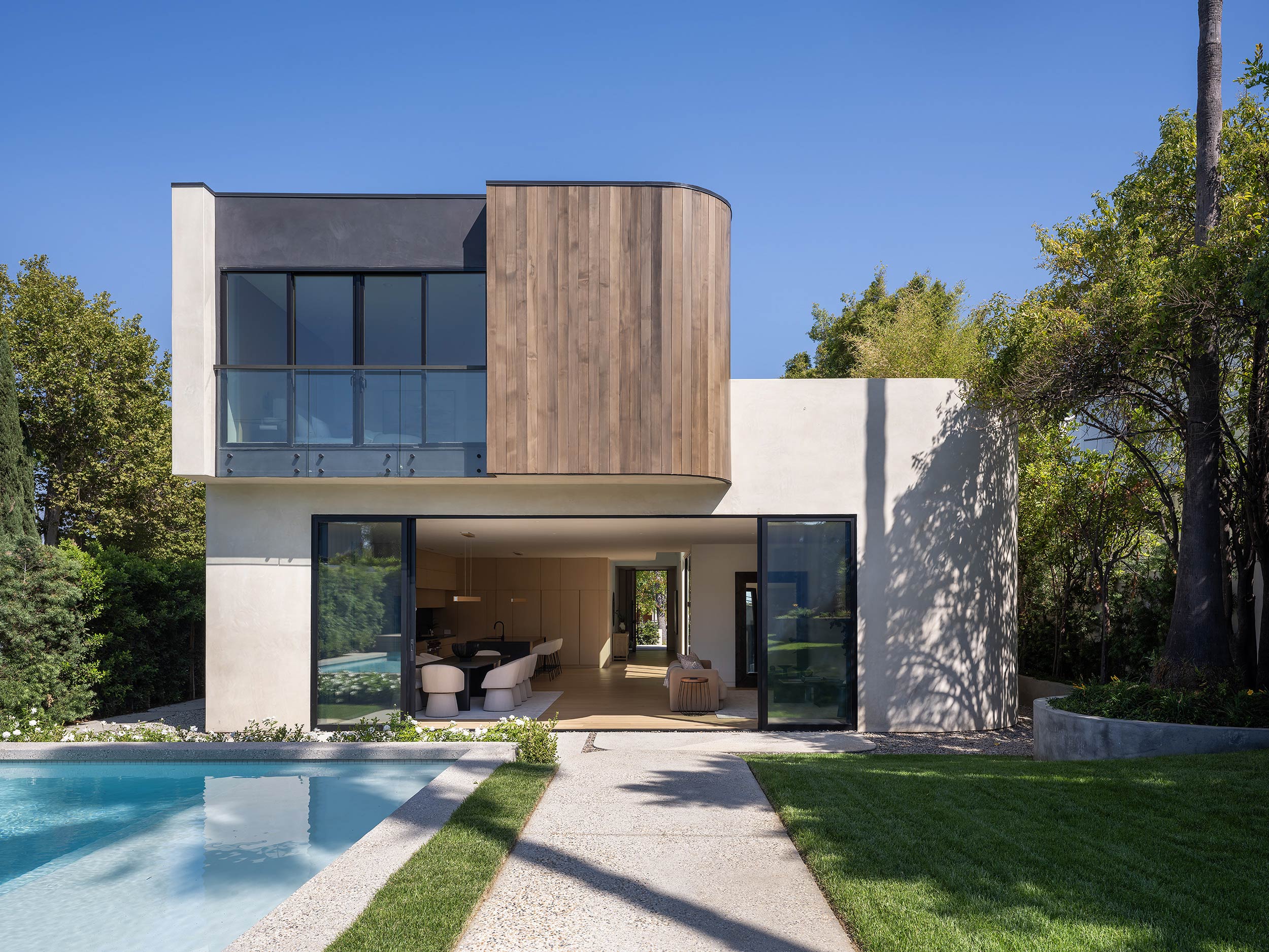 This contemporary house and ADU in Los Angeles explores curvature as a response to the site. The project is organized around a cluster of trees near the center of a long, narrow property. Rather than treating the trees as obstacles, the house bends around them, allowing the landscape to become the organizing element of the design.