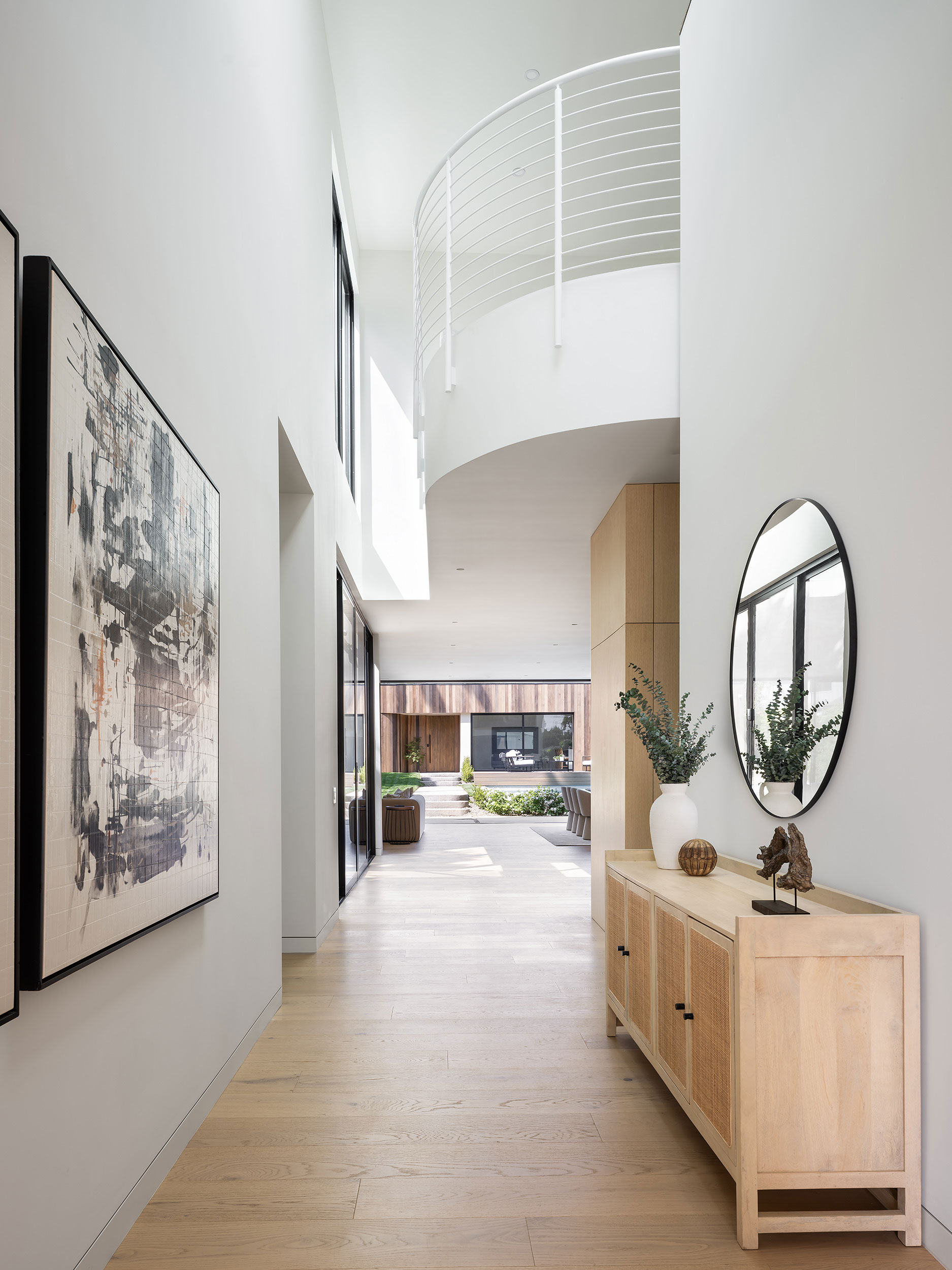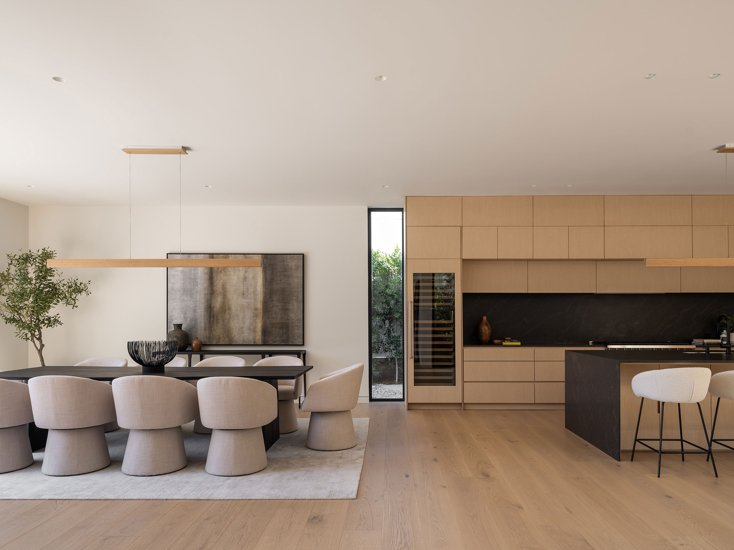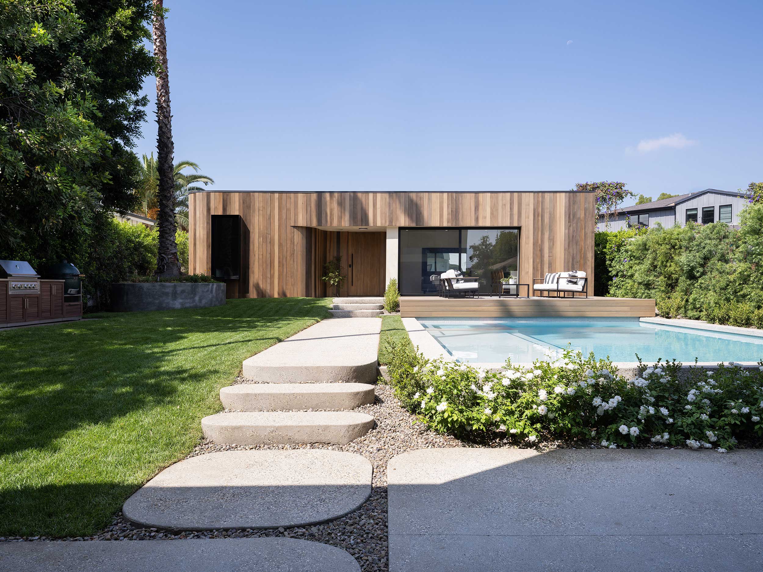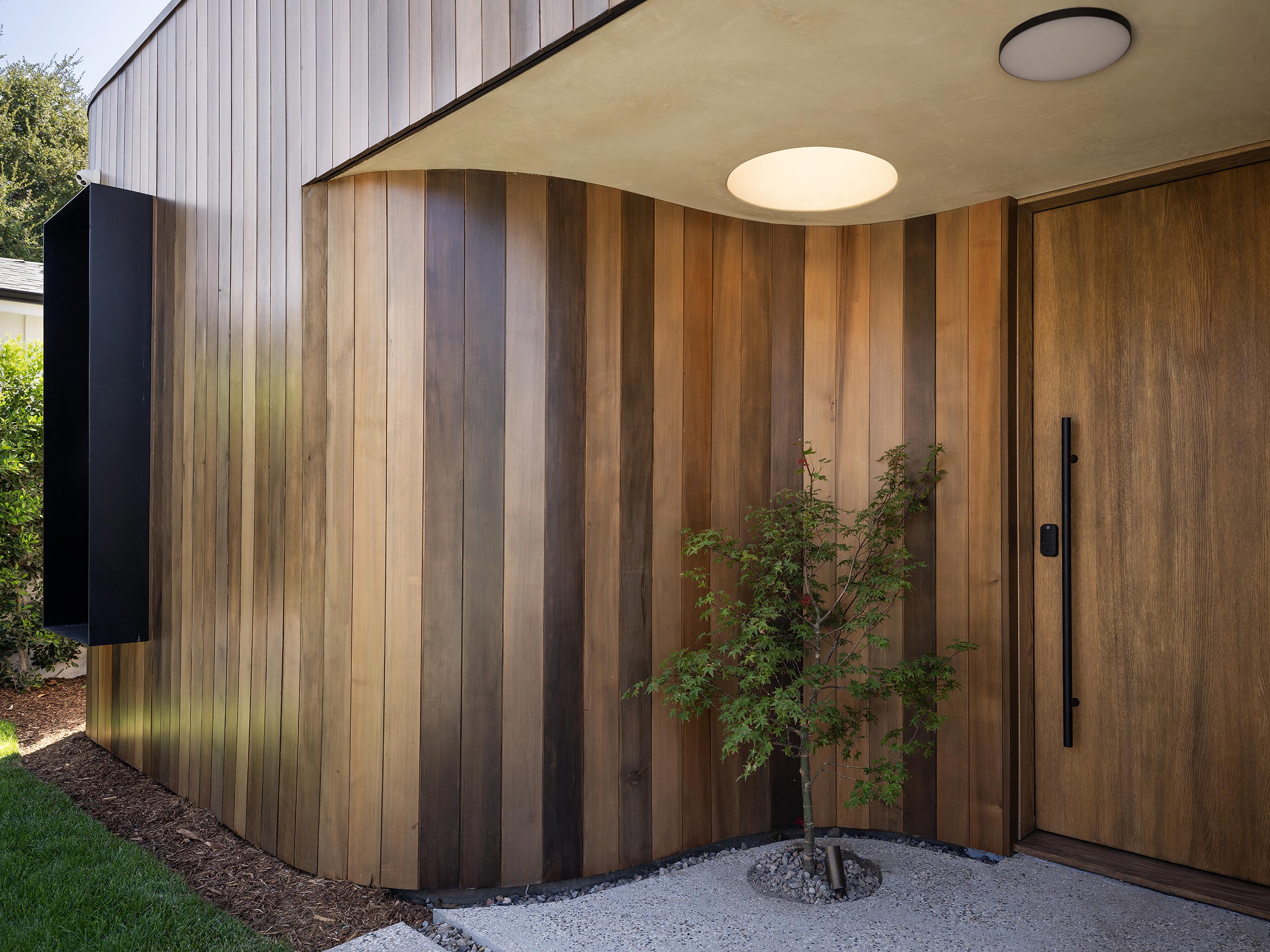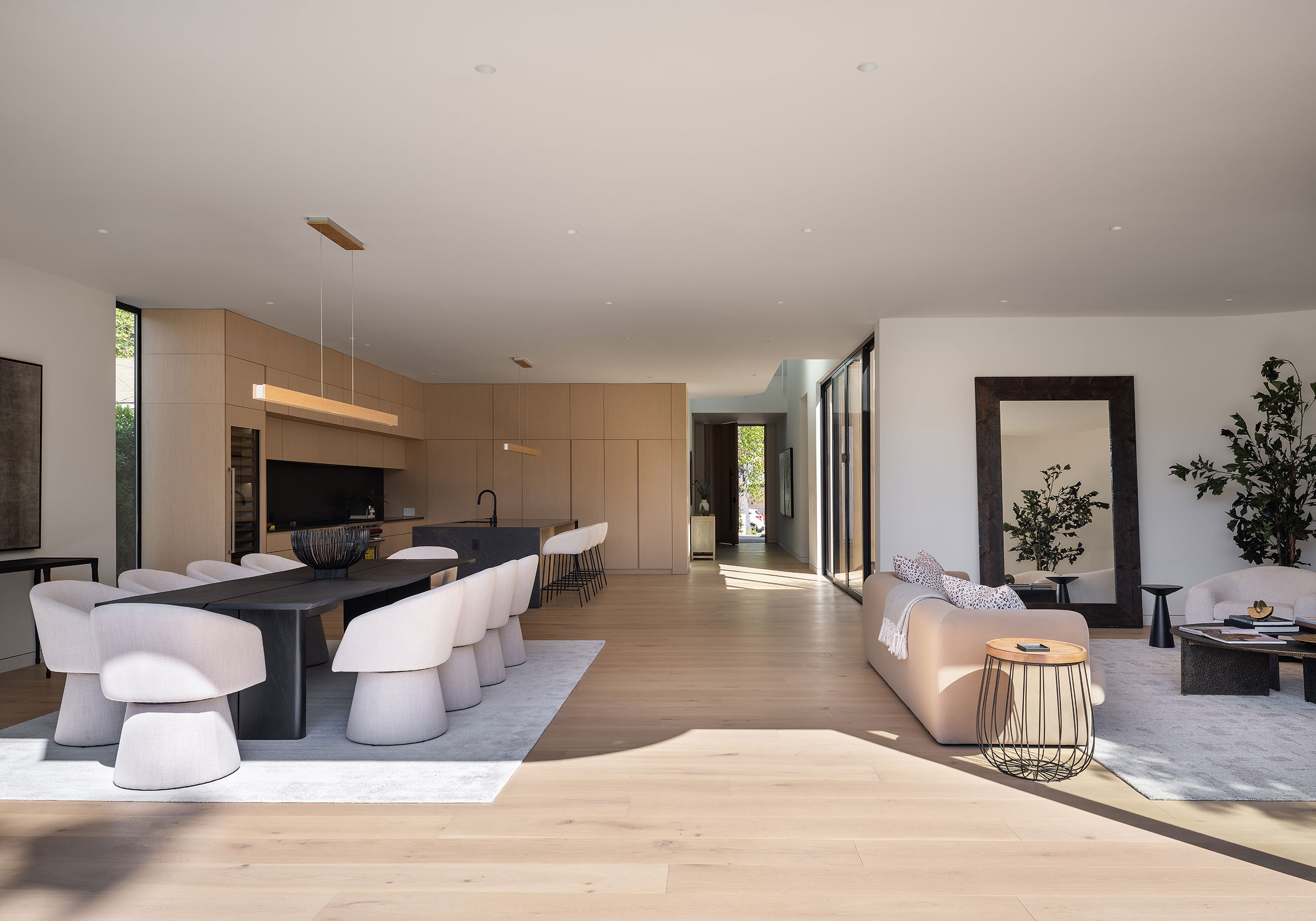 This contemporary house and ADU in Los Angeles explores curvature as a response to the site. The project is organized around a cluster of trees near the center of a long, narrow property. Rather than treating the trees as obstacles, the house bends around them, allowing the landscape to become the organizing element of the design.
