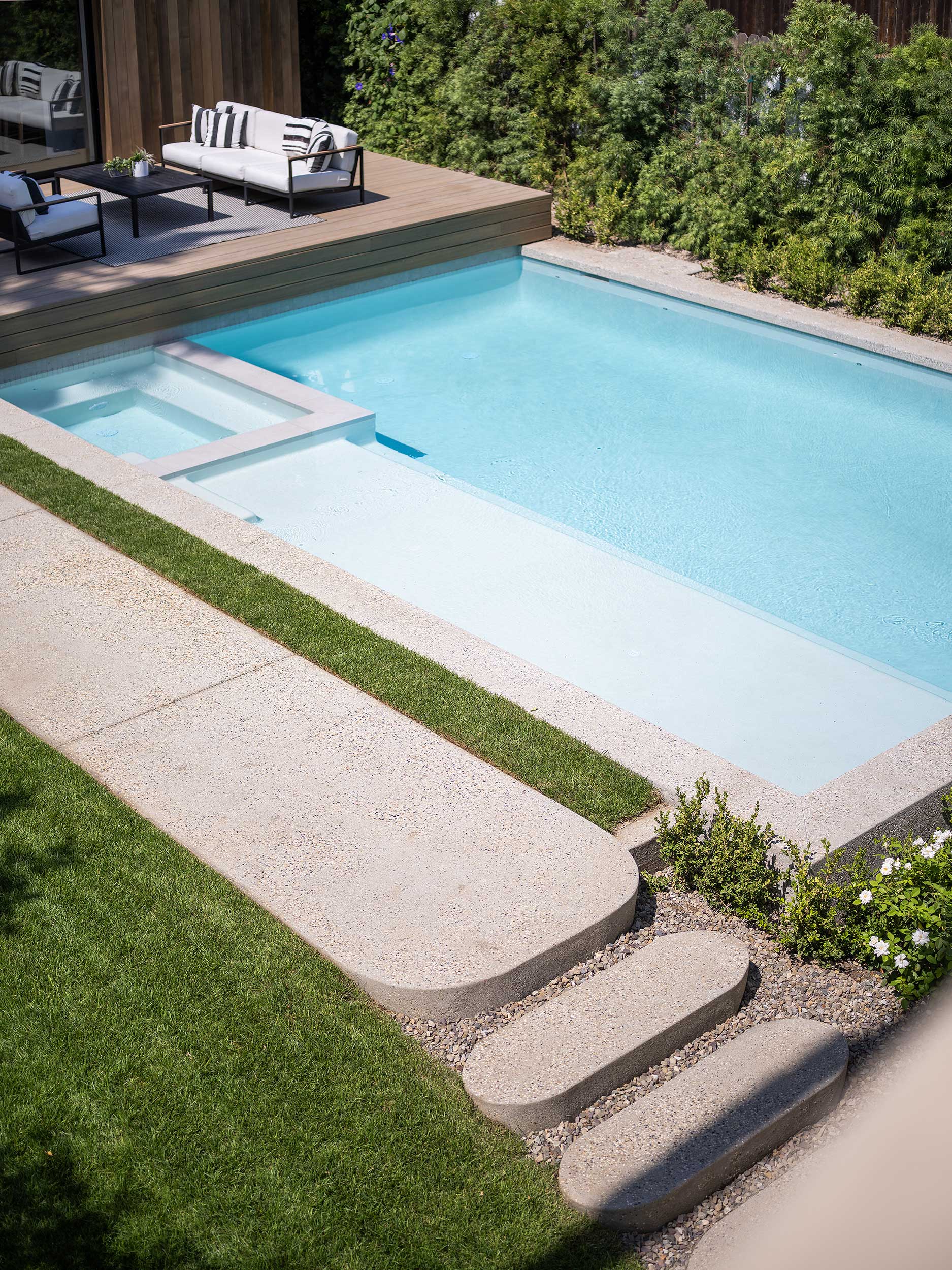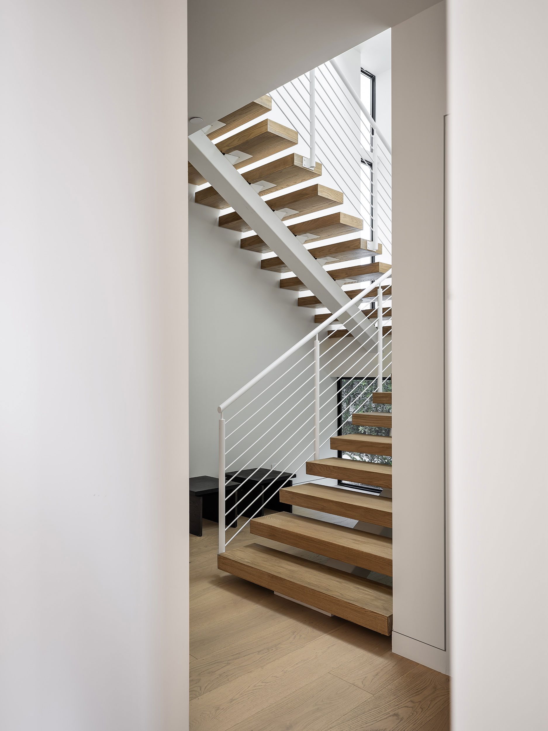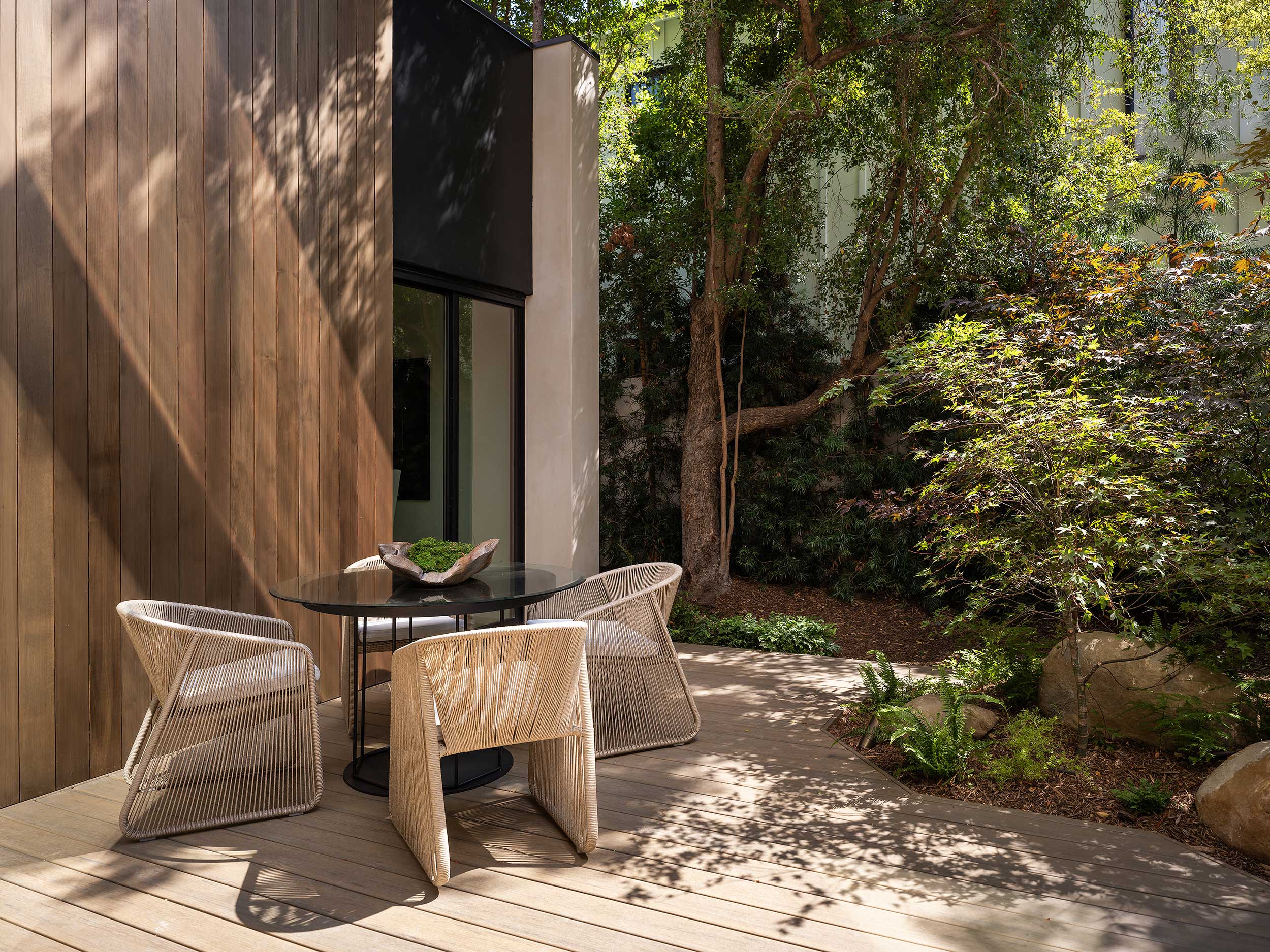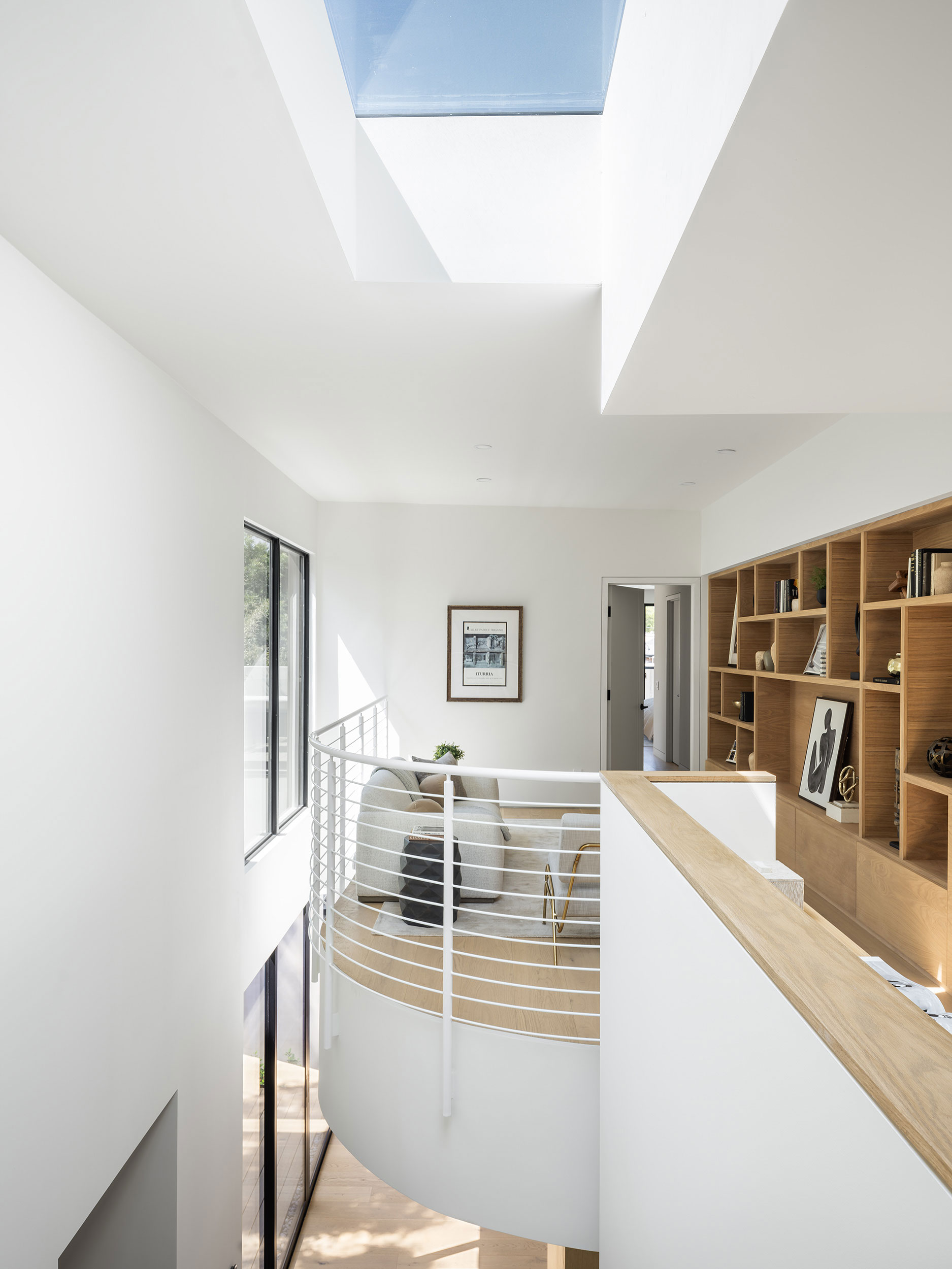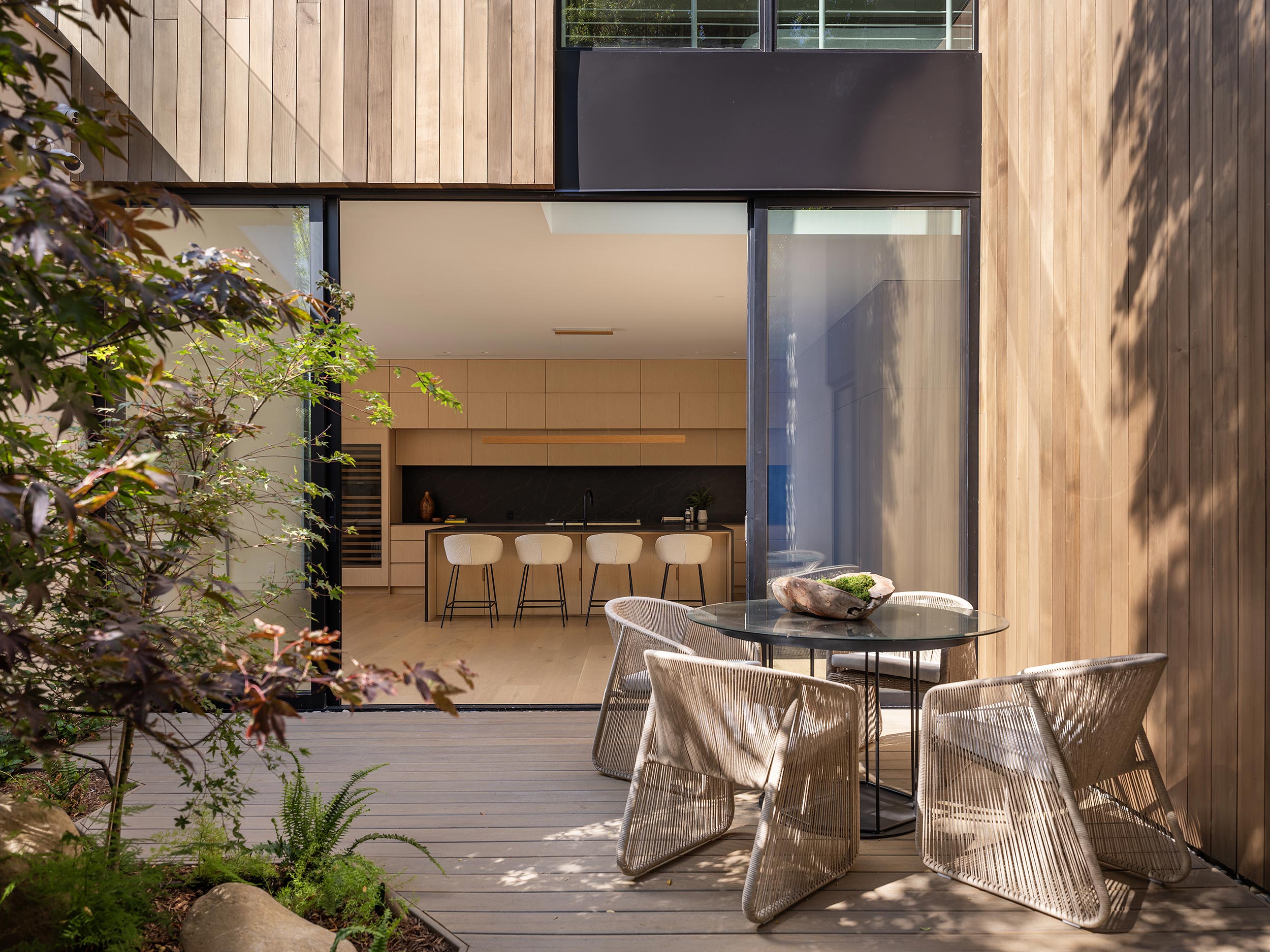 From the street entry to the interior void and the detached ADU at the rear of the property, the project maintains a consistent architectural language that connects buildings. The ADU’s facade is also carved to create a space for a courtyard of its own, reinforcing the project’s broader intention to preserve and build around the landscape.