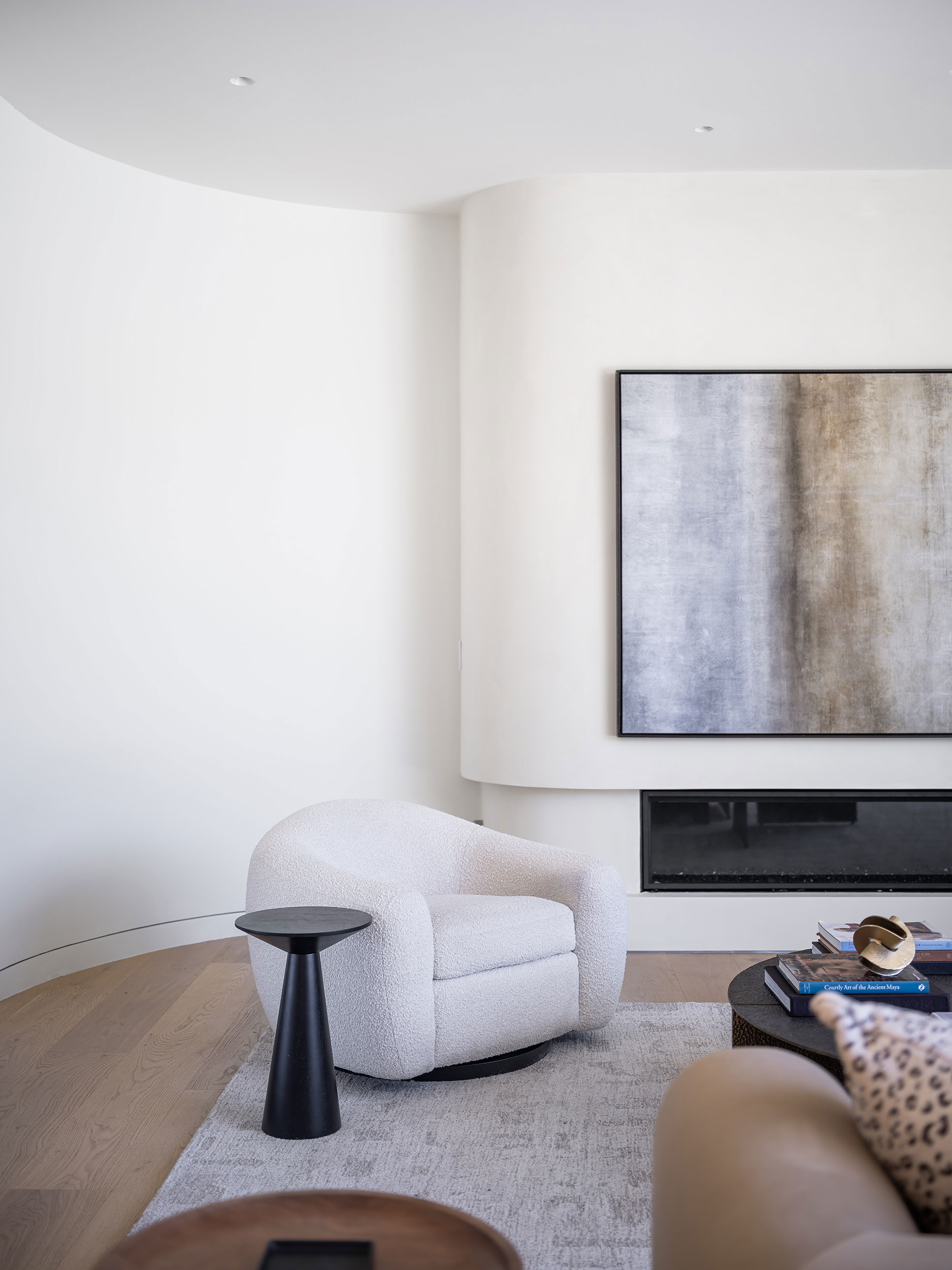 The curved walls grow out of this act of containing the courtyard. They are not applied gestures, but the result of shaping the building around the landscape and guiding movement through the plan. These curved edges soften transitions between spaces, frame views toward the garden, and draw daylight deep into the interior.